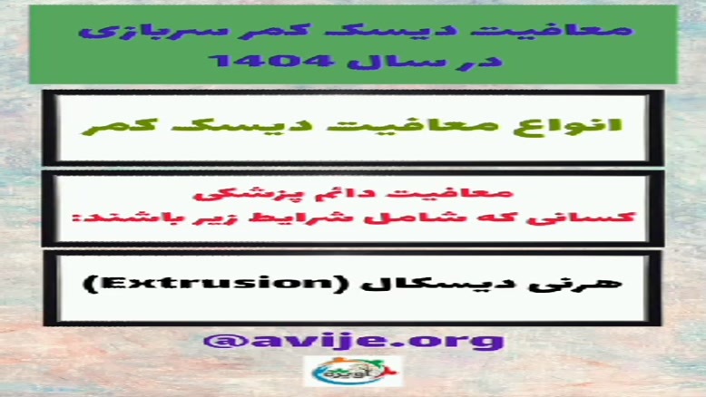 #معافیت_دیسک_کمر #مشاوره_آویژه #مشاوره_سربازی #معافیت_کفالت #کفالت_پدر #کفالت_مادر #مشاوره_نظام_وظیفه #معافیت_سربازی #کفالت_برادر #معافیت_پزشکی #امریه_سربازی #کسری_خدمت #معافیت_تحصیلی